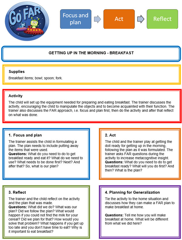 - Focus and plan: The child may already have ideas on how to plan breakfast but the trainer should guide where needed with questions. The example gives some you can try. The idea is not to lay out the steps for the child but have him/her think about what will be needed and together discuss a plan. Include anything the child might have overlooked, like rinsing and putting the bowls and utensils in the sink afterwards to clean up. This again should be customized for the details of the particular child.