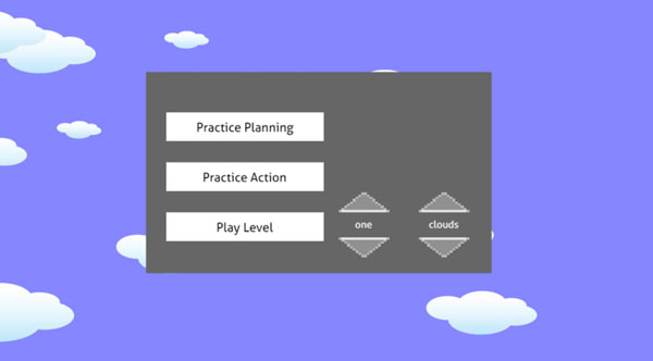 ‘Play Level’ is a 13-level practice where the child will, at each level, make a new PLAN, ACT on it, and REFLECT using the same controls and screen layout learned in the previous ‘Practice Planning’ and ‘Practice Action’. By clicking the arrows to the right of Play Level you can pick the start level, 1 to 13. It is recommended that you begin the first time at level 1 since they become more difficult. After any level ends there is a reward screen and when you click the arrow on the reward screen it automatically goes to the next level. You can choose to end play or change the level at any time by using the ‘Options’ button above the Score Bar. One of three different background screens (clouds, underwater, and space) is selected using the arrow keys beside the level setting.
