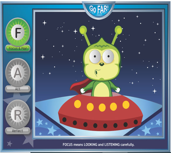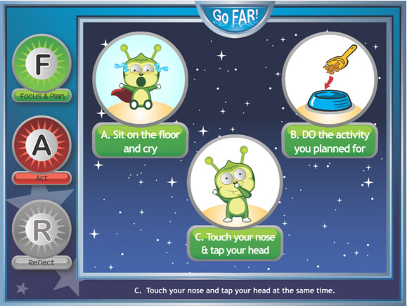 This simple 5 1/2-minute animation tells the story of a spaceman (the character in all games) making a plan to feed his cat. It has 4 quizzes that pause and ask the child to click on a choice based on what he/she has learned so far. Play at least once, and as often as your child requests. Without this breakdown of the FAR steps, the later game play is difficult to follow.