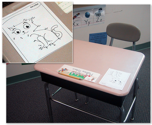 This can be done individually or with the whole class. If done individually, shrink it and place the dot 2 dot on the student's desk. If done with the whole class, enlarge it and post it on the board, or in an area that is visible to all students. Choose a dot 2 dot that is age appropriate and of interest to the student(s) in which you are working. Connect the dots as the student or students are exhibiting the desired behavior and initial the last dot you've connected. Once all the dots are connected, the student(s) can earn the agreed upon reward. It may simply be to color in the picture!