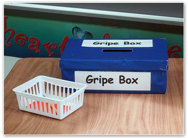 The Gripe Box is designed to cut back on the number of tattle tales told to you each day. Using a shoe box, simply cut a hole in the top and label it the "Gripe Box." Next to the box, have a supply of scrap paper and a pencil. When a student has a complaint that is not of urgency, he/she should write it on the scrap paper and place it in the Gripe Box.