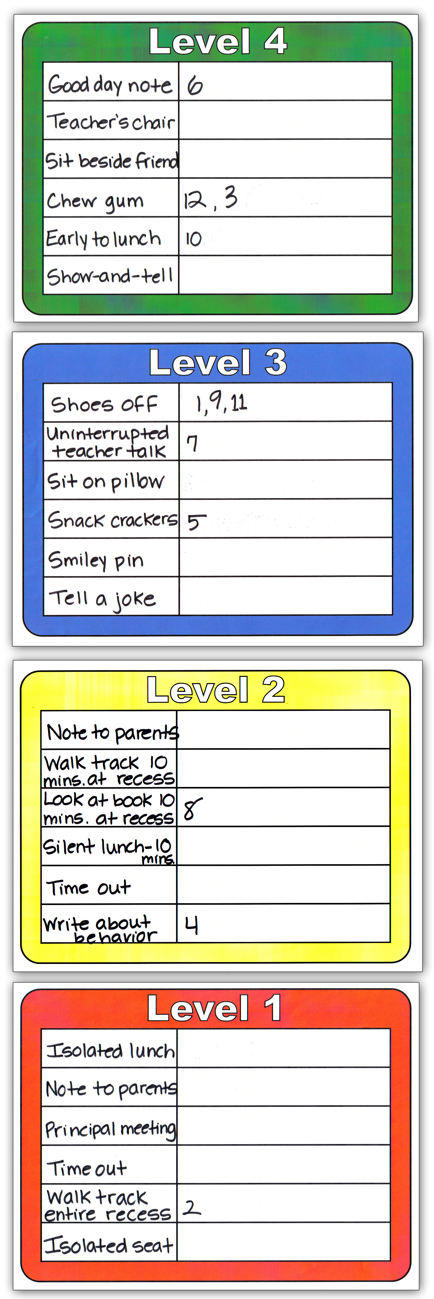 Level 4 - sit next to a friend, good day note home, sit in teacher's chair