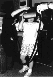Brief Report: Two Case Studies Using Virtual Reality as a Learning Tool for Autistic ChildrenReprinted with permission from the Journal of Autism and Developmental Disorders, Vol. 26, No. 6, 1996.Dorothy Strickland , North Carolina State University INTRODUCTIONIn 1895 the Lumieres' documentary Train Entering Station reputedly made audiences flee or duck for cover, fearful for their lives (Pirie, 1981). Film is now widely recognized as a technology capable of making the human body respond emotionally, as when adrenaline increases at a horror movie. Virtual reality carries the fantasy a step further, immersing the user in an illusion which responds as the real world does. The human interaction with the imaginary world is not conducted through watching other peoples' motions but by controlling the new reality through one's own actions. For this reason virtual reality (VR) allows individuals to explore new ways of responding and learning. Definition of Virtual Reality There are several levels of VR, the most sophisticated of which is called immersion. In this version the user wears a headset containing two small video screens, one suspended in front of each eye. As the person moves, the movement is tracked and used to reposition the user's location in the scene. Previous Applications Why Consider VR for Autism? Sensory Problems. Many children with autism have difficulty with multiple sources of sensory input (Grandin & Acariano, 1996). Stimulation in certain settings can be overpowering, causing difficulties and behavior deterioration. VR isolates specific stimuli from the environment and allows subjects to control how much they will experience. Complex stimulus arrays can be simplified. Lack of Generalization. Difficulty generalizing behaviors learned in a single setting to similar appropriate situations has frustrated treatment efforts in autism. What is taught in one situation does not necessarily occur naturally in related appropriate situations. VR makes generalization easier because of the realism that it brings to treatment situations. Visual Thought Patterns . Many have observed that thinking in people with autism is primarily visual (Grandin, 1992; Schopler, 1987). Intervention techniques have been successful when they capitalize on these visual strengths (Mesibov, Schopler, & Hearsey, 1994). VR, emphasizing visual skills, seems to be an appropriate modality for people with autism and should give them an excellent opportunity for learning new concepts and behaviors. Individualized Treatment. Although there are general characteristics that all people with autism share, effective approaches must individualize their techniques to meet the needs of individual clients (Schopler, Mesibov, & Hearsey, 1995). Computerized instruction using VR allows for constant readjustments, based on the needs and skills of individual clients. Learning imagery can be readjusted to compensate for individual styles and changing patterns. Responsiveness with Computer Technology. Although computers have not been adapted by special education programs as quickly as some would like, there is increasing evidence that they represent an effective new approach to education and learning for children with developmental disabilities (Howard, Buch, Watson, & Shade, 1991). Given the characteristics of autism and the encouraging preliminary data, it appears reasonable to expand the use of computerized instruction for individuals with autism and VR is a promising avenue for this extension. DESIGN OF STUDYThis study was designed to determine if children with autism would tolerate VR equipment and respond to the computer-generated world in a meaningful way. Project Team Subjects S. is a 71/2 year-old girl with very strong visual spatial skills, limited verbal and language based abstract reasoning skills. Recent cognitive testing resulted in an IQ of 91 on the Leiter International Performance Scale. She was able to do one subtest of the WPPSI-R with good success (Object Assembly), but was unable to complete other performance tests. On the CARS (Schopler et. Al., 1988), she was classified as Mild to Moderately Autistic with a score of 36.5. R. is a 9-year-old boy with somewhat better language skills, but also considered a visual learner. Cognitive testing resulted in an IQ of 62 on the Merril Palmer Scale of Mental Tests. He was able to do relatively well of the Object Assembly test of the WPSSI-R, but unable to complete other tests on this scale. On the CARS, he was classified as Mild to Moderate Autistic with a score of 34.0. The interactive controls standard with most VR were difficult for the children to use. Pointing also would not work because the computer cannot track the hand motion unless it has a tracking device affixed, and it is disconcerting to point at something in front of your face and not see your arm and hand. Because both children had some language skills, we primarily used simple verbal responses such as "car," "red," "blue," and walking motion to indicate response to the world. Design of Sessions Physical Layout and Schedule Schedules were used to explain which activities would occur and in what sequence they would occur to help the children anticipate and predict events. Each child had a basic routine of work first and then play with the VR test between. In later tests the play period was dropped. Preliminary Helmet Acceptance Efforts RESULTS AND DISCUSSIONS. and R. came in separately for approximately 30-minute to 1-hour sessions. During that time both children repeated the work, helmet, play cycle multiple times. S. had twenty-one 3- to 5-minute sessions over a 7-day period, and R. had sessions of shorter duration over a 4-day period. The goal was to teach the children to accept the helmet and pay attention to the images. We initially asked each child to identify cars when they appeared and say the car color if possible. On the first attempt, both children accepted the helmet and immersed themselves in t