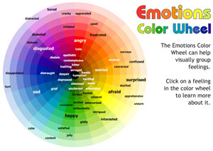 On the Emotions Color Wheel, the emotional types are grouped by color (“happy” = green). In terms of range, mild emotions are on the outer perimeter of the circle; the most extreme emotions are found in the circle’s core.