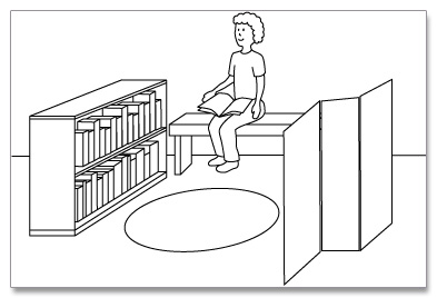 Area ScreenA section of a room can become a quiet seating area by using a screen to remove the visual distraction of other children. In the below illustration, a bookcase and commercially available 3 foot folding screen visually isolate a bench placed against the wall. Having books in the bookcase allows the child to read while seated on the bench but to not see other activity in the room.