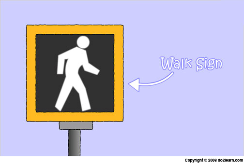 Now it says "walk" on the walk sign. The walk sign, the walk sign. So I can cross at the walk sign, very carefully.