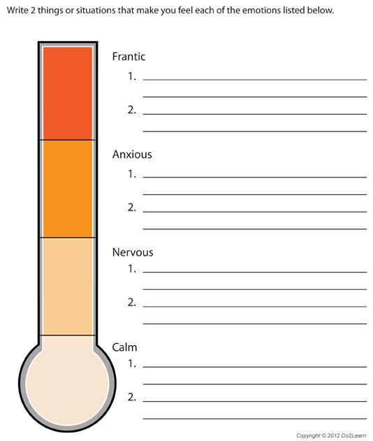You are working with your student to help him identify coping strategies that align with increasing levels of emotional intensity. This graphic organizer provides a visual framework in which he can identify appropriate responses in order to prevent a meltdown.