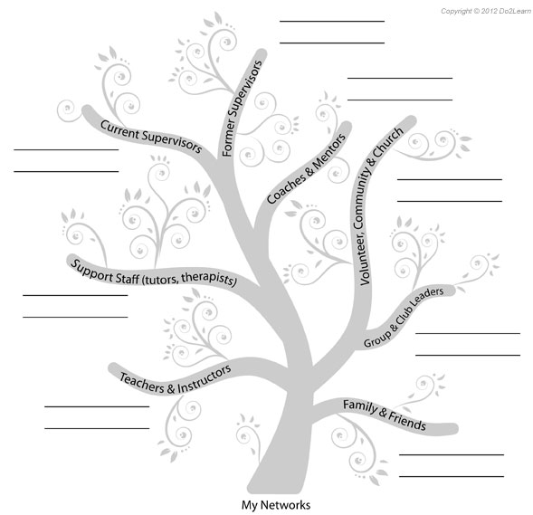Your student needs to obtain a part-time job or volunteer opportunity, and he is struggling to identify potential networking contacts. One strategy is to visually represent networking channels to this student so that he can more independently and comprehensively identify people in his network.