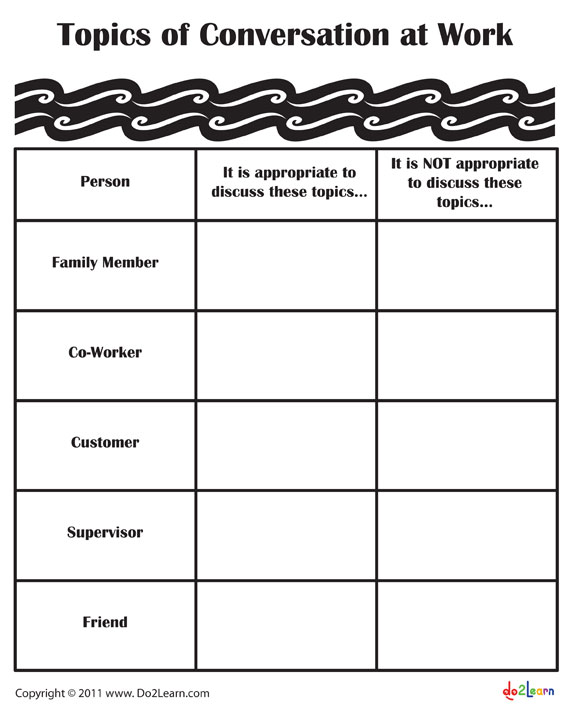 A next step within the intervention process: You might then use the information on this organizer to draft an individually tailored social narrative on “Topics of conversation at work,” in order to elaborate on the rationale behind these social communication rules.