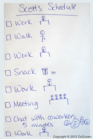 Many individuals have used schedules for years in school, with the help of student agenda books, electronic planners, clipart, Google images, photographs, or downloadable programs like "View2do." If those systems have worked well to promote accuracy and independence, and the student is comfortable with them, there is no reason to dramatically alter that format for the job setting.