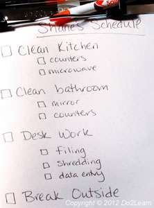 In school, the student may carry their schedule in their backpack, on their smart phone, or in their pocket. In the work place or within certain school settings, their schedule could be placed on a clipboard with a pencil attached to mark off items as they are completed. Identifying and teaching the individual to always place his schedule on a hook or designated spot at each site is one key to success.