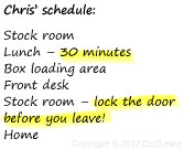 The amount of information on the schedule will vary depending on the individual. Some individuals respond better to simple single word schedules, others can use short phrases, while others can handle more detailed information.