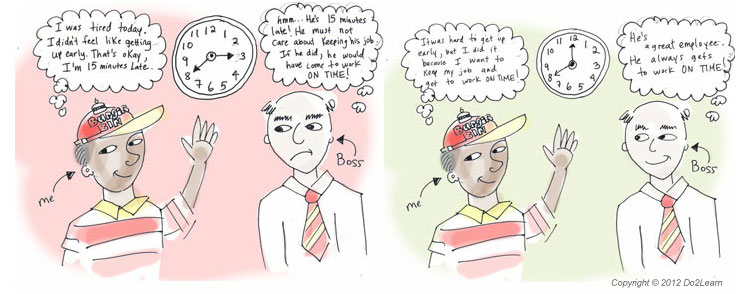 Thought stories are very similar to coping comics in that they use drawings or comics to clarify attribution (details that explain why something happened) or perspective (what someone is thinking). The main difference between the two strategies is that coping comics use open dialog (back and forth conversations) to teach what to do or say in certain situations. Thought stories use thought bubbles to show what people are thinking.