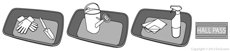 In some situations, the student may be required to work in an area that is away from the bins. In such cases, the student would be taught where certain items go when a task is finished (e.g. window cleaner goes in the cleaning pantry; a completed task goes on the back shelf of the classroom).