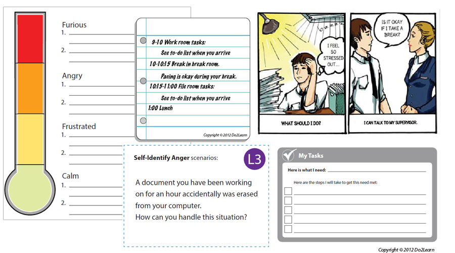 Employers expect certain standards of behavior in the workplace, but this can present a challenge for students who struggle with self-regulation of their emotions or behavior. This section provides resources to strengthen these self-regulation skills. Topics include managing anxiety and frustration, identifying situations that may cause stress, developing self-advocacy techniques, and managing private and repetitive behaviors.