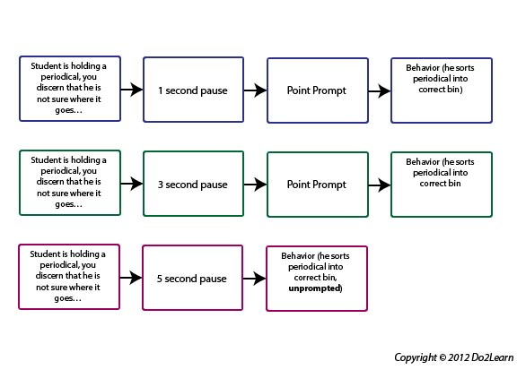 As the student demonstrates increasing independence with a skill, delay your gestural prompt to allow time for the student to respond without prompting. Below is a basic example to illustrate how you might increasingly delay prompting across practice opportunities: