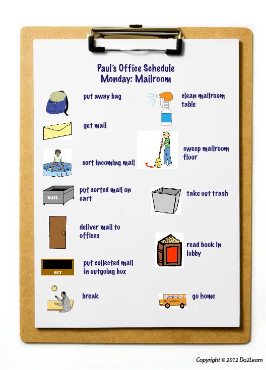 The student’s schedule should be kept in a safe location so that no one else is likely to move it. The student will then know where to look for his schedule everyday when he arrives at the work site. It may be in his locker or at the specific place for his belongings. In this way, you can build a routine of putting up belongings and getting the schedule to determine where to go next. *Remember that a consistent daily routine that always stays the same is actually a mirage! Nothing stays the same for long in any work space, and job priorities and tasks do change. Do not expect the student to learn a routine and just follow that routine each day. How upset or disoriented will he be when the supervisor tells him that he needs to do something different one day? The schedule is a support that builds independence and assures predictability.