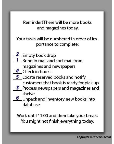 You might devise a to-do list that allows for flexible sequencing of tasks. For example, library assignments may vary day to day with heavier workloads or expectations occurring after a weekend or a holiday. An excess of returned books, arrival of extra periodicals and newspapers, and backlog of book reservations may await the staff. To prevent the student or library staff from having to devise a brand new list every day, it might be appropriate to develop the set list of duties that can be printed each day, leaving a blank space next to each item in which the sequence can be hand-written: