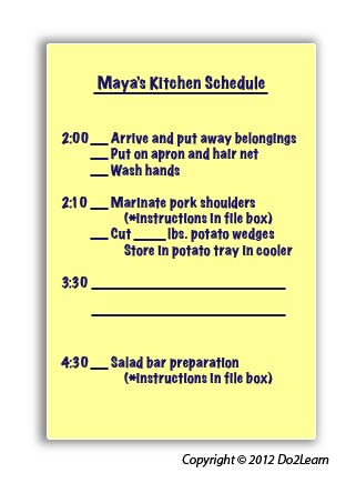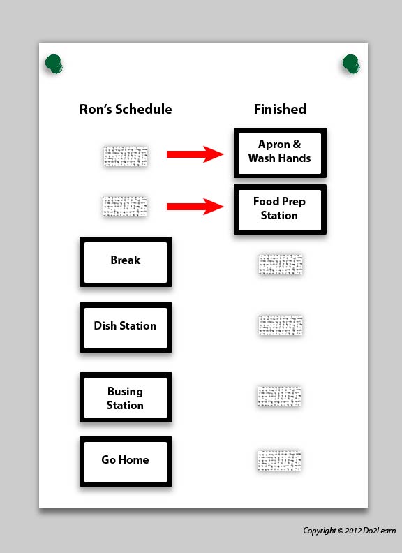 Is it beneficial to laminate the schedule so that the manager can change it as needed and so that the student can check it off or cross it out as needed? Protection of schedules against water and food damage suggests the need for thick laminate, or for a schedule on an erasable vinyl or plastic surface, instead of replaceable daily paper schedules. Since many tasks will be consistent, even if they occur at different times during each shift, the student may alternatively have the tasks printed on laminated scheduling cards that are connected to the schedule with Velcro. (It might be necessary to have extra Velcro available in order to replace it on a laminated schedule on occasion) As the student completes each task, he can remove the task card and place it in a “finished” envelope attached to the bottom of the schedule.