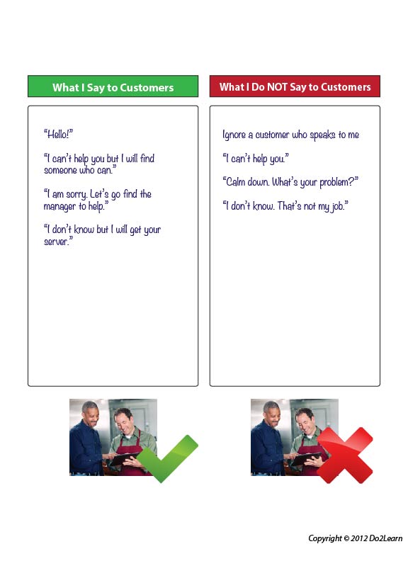 It is possible that you will need to create a graphic display that shows the student what to say and what not to say to customers. This can be used in practice sessions or, as needed, on breaks on the job to prepare for customer interactions. The graphic organizer may prove helpful when used with scenarios that provide practice in customer interactions.