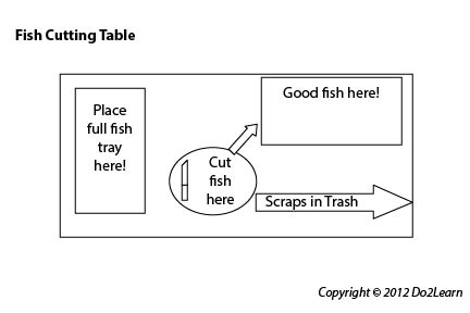 Silhouettes or diagrams on workstations can support organization. The diagram uses shapes and labels to assist the student in placement of materials in his workspace so that they are organized for efficiency. This example shows how a fish-processing table may be labeled with markings (e.g. tape or other options to meet health code requirements) that illustrate how to move through the process of cleaning fish: