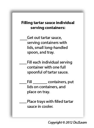 Food preparation tasks may need to-do lists that list specific instructions with spaces to fill in amounts as they could change on a daily basis. Below is one example: