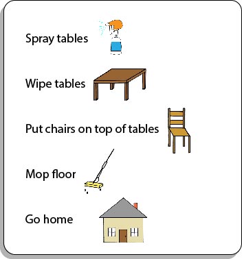 At times, visual instructions and to-do lists are very similar. A to-do list tells the student what tasks they should be doing and in what order. In other words, it is a list of instructions of what tasks to do. Some visual instructions, on the other hand, clarify the steps of a task. There are spontaneous commands from a supervisor or customer on the go. Thus, the student should be taught to follow all types of instructions.