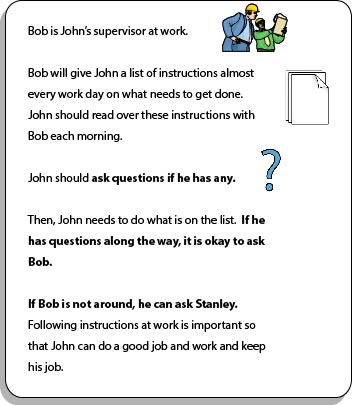 Take a paraphrased sentence from the story, such as “If you have questions, ask Bob or Stanley for help” and post it in the student’s work area.