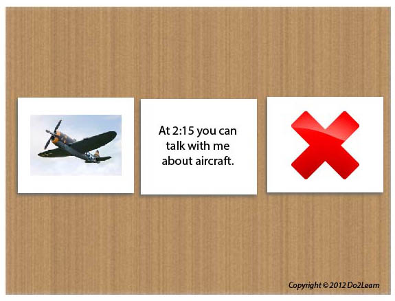 For individuals who may tend to monologue about a single choice topic, a visual cue card may be necessary to support self-regulation by indicating appropriate times to discuss the topic. For example, one side of the card may have the words “World War Era Aircraft” or a picture of an airplane. The other side of the card has the written text or picture with a “no” symbol, or a symbol that indicates when he can engage in talk around his high interest area. Place the card on the student’s desk after teaching him that it is appropriate to discuss World War era aircraft only when the card is face-up. When the “no” side of the card is showing, this signals to the student that he should avoid that topic. You might direct his attention to that cue if he is starting to monologue. In this way, the cue replaces the verbal prompts that you might otherwise have to provide to redirect the student.