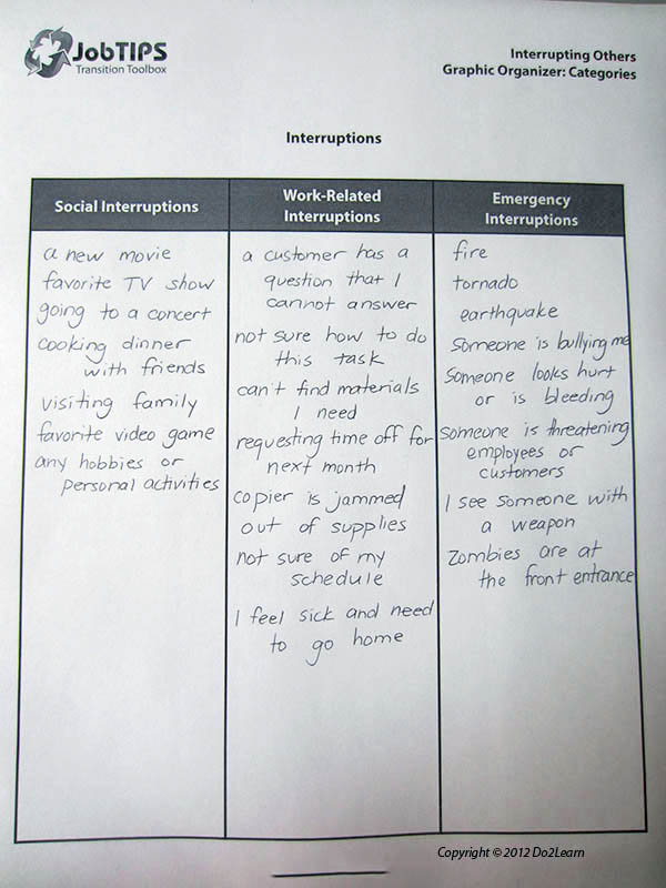 There has been a popular rise in interest in zombies and vampires over the last several years. Does this student share such interests? If so, visually or thematically incorporate them into the supports to increase interest and buy-in. For example, when teaching the categories of interruptions in the first graphic organizer above, include one or two zombie-related events within the list of realistic, relevant events: