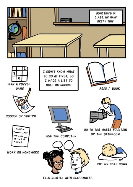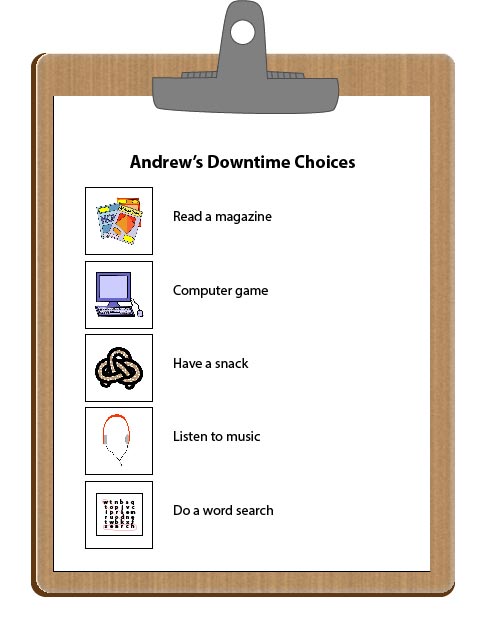 Visual instructions and cues will be very important in structuring the student’s downtime. Visual supports may be necessary in various situations. If the student has trouble initiating a downtime activity (meaning they finish their work and then have no idea what to do), you will need to create a visual cue or list to tell them what to do next. Visual reminders are also important because downtime can be unexpected and sometimes anxiety-provoking. The visual reminder takes away that element of the unexpected, but gives the student some preparation and guidance as to what to do. This reminder may be written as a reminder on their schedule or to-do list.