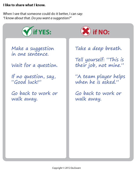 Consider the use of a graphic organizer to help the student evaluate written scenarios, video examples or live role-play situations. The graphic organizer might help the student to identify what is happening in that moment, and what the other person is doing (facial expressions, movements, words, etc.). He can use this information to guide his decision – "should I make a suggestion, or keep my thoughts to myself?"