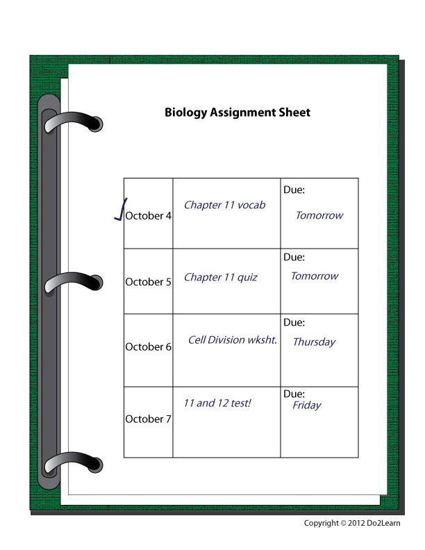 Does the student need an ‘assignment sheet’ at the front of his subject binder for each class? This assignment sheet becomes the place where the student always writes down the assignment and deadline. In this way he focuses on that first step in the problem-solving process and does not yet focus on deciding where to put it or how to organize it. Your goal is to get him to write it down in one predictable location where he can always find it for later organization and action.