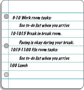 Repetitive behaviors often provide some type of relief or enjoyment for individuals. Therefore, the goal is not to eliminate them entirely, but rather set parameters around them so that the student is appropriate at the workplace. Provide the student with an opportunity to engage in repetitive behaviors using their schedule. If they use a written schedule, write in when they are allowed to engage in their repetitive behavior and where. It may help to also write how long it is okay to engage in their repetitive behavior.