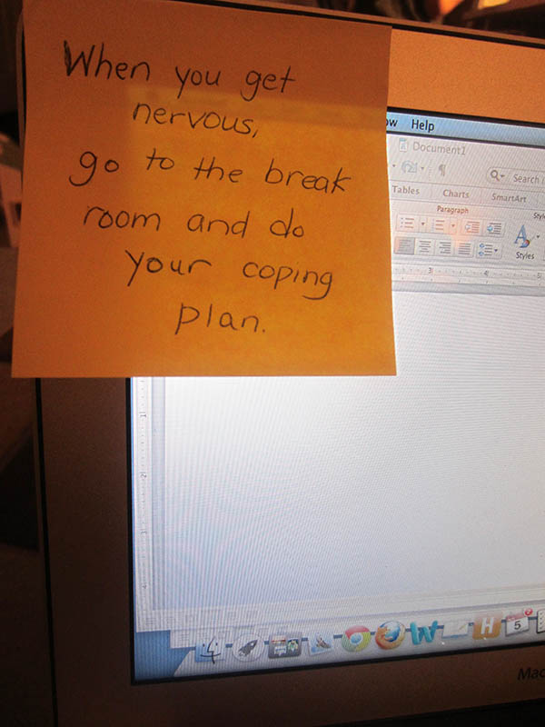 Visual instructions or reminder cues will be very important, particularly so that the behaviors generalize to the work setting. For example, you could write, “When you get nervous, go to the break room and do your coping plan” on a note posted on their computer so that they will easily see it.