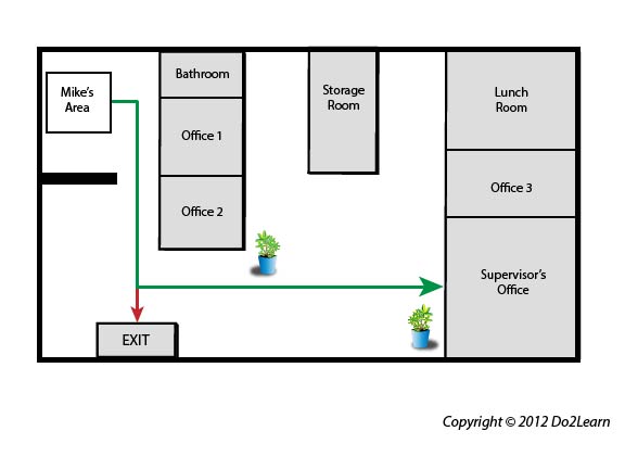 A floor map may be used to show a student where to go when he needs to relax or to escape a threatening situation. Much like the fire escape routes posted in businesses and schools, a map of the student’s worksite can include arrows to indicate where to go in case of a fire, a designated safe space, or how to get to a supervisor’s office.