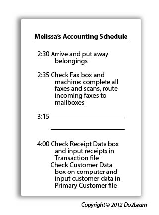 With many office accounting, merchandise processing or shipping/receiving positions, there will be some consistencies in the activities of any work day, depending on the time of the shift. Creating template schedules for various shifts may assist clarity of where to work and the general activity that will be completed. While some tasks may not shift from day to day, others do and so they are not always present on the template. Generally, the trucks bring merchandise on specific days. On other days, the focus may be rotating stock, creating displays, cleaning chores, etc. In accounting positions, because supervisors and co-workers are often willing to fill in the blanks on a list or schedule prior to the student’s shift, this is a natural support that can be used in the future: