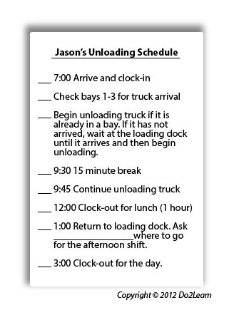 For a job with less time-specific tasks that vary in duration, such as unloading trucks that take a few minutes or several hours, the student may benefit from a schedule structured around times for certain planned events: