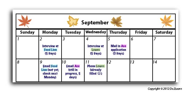 A reminder card could be attached to the schedule to help the individual determine the time frame in contacting each company. Some students might need a more detailed calendar listing specific times to engage in job searching, contacting the companies, and scheduling other activities to distract while waiting. Below are two examples: