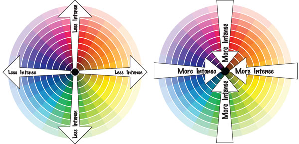 Visually, it might help to think of basic emotions as levels of color that become more intense as they pull inward towards the circle center. Brighter, bolder colors are associated with more intense emotions. The most intense emotions are demonstrated by people less often and are contained within a smaller visual space near the dark center. Less intense emotions are on the outside.
