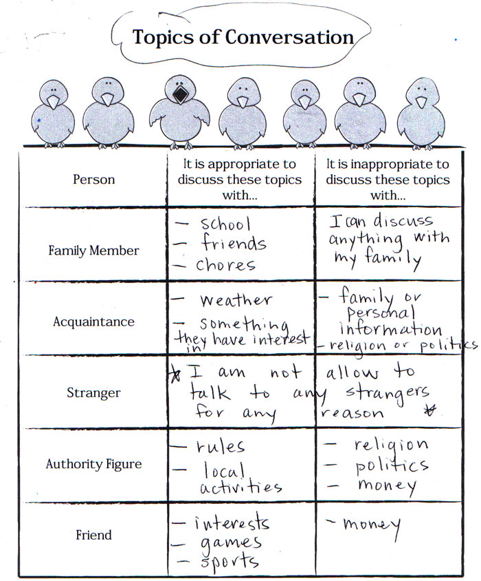 - Have students fill out each box within the T-Chart with (1-3) topics of conversation. Use parents or others close to the student to assist to make sure the topics are within the values and expectations that are appropriate.