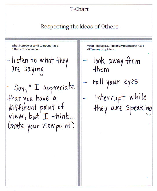 - Complete the T-Chart graphic organizer to help your student know what to do and NOT to do when someone expresses a different viewpoint