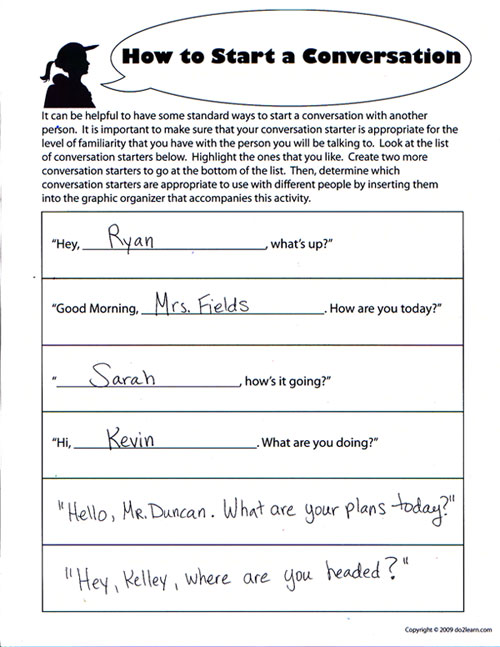 It is important to make sure that you help your student/child find the "words" that they are comfortable with and can easily remember to use as a "conversation starter". Make sure to go through the activity and specifically identify the people that your student generally has opportunity to make conversation with and determine the level of familiarity he/she has with that person. This will help you guide your student as to what types of conversation starters would make the most sense for them |