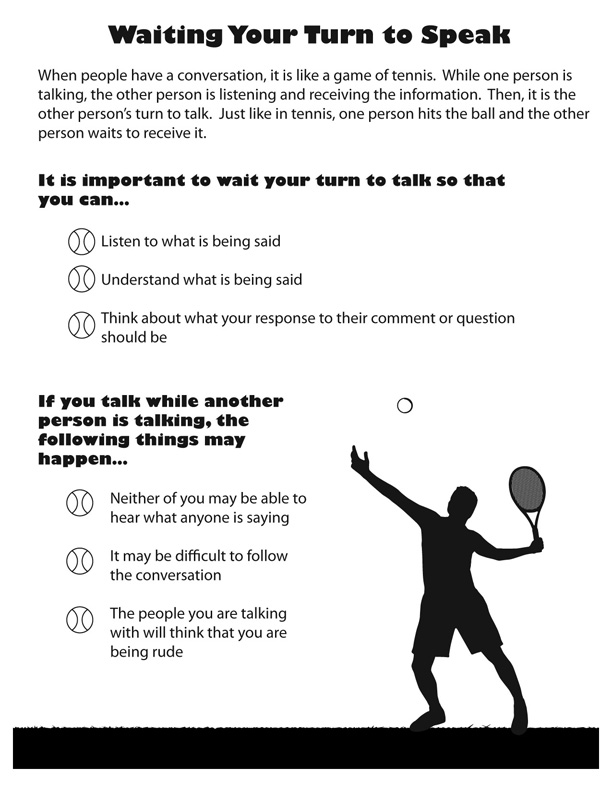It is important to understand that individuals with communication issues have a difficult time understanding the need to both give and receive information. This process takes time and practice. Set time aside to “practice” having conversations and following the rules for waiting turns to speak. It can be helpful to “watch” others either in person by role play or in video clips having conversations. By providing opportunities to see how people wait their turn to speak or in some cases don’t wait their turn to speak, you give your “learner” a more concrete, visual way to identify the reciprocity process. |