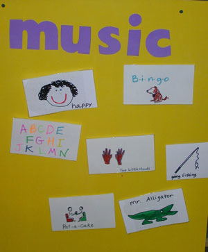 Children select from a poster of song titles, then follow along with pictures of words and motions.