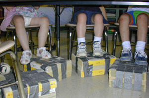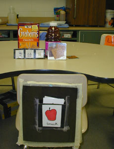 snack centerPicture cards of food and drinks are used with the "I want" card. Each child's name is on his chair and everyone has a footstool for his feet. |