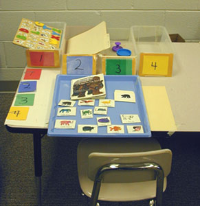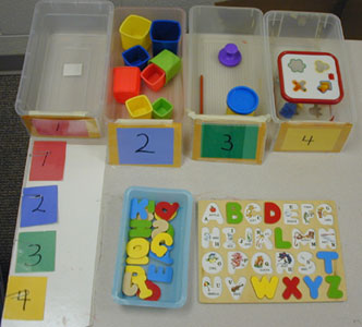 Matching and ABCs are two work station activities. The tasks are color-coded and numbered for independent learning.