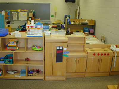 This view from the back of the room shows the toy shelves and kitchen center. The worktables are against the wall on the right. Circle-time is held in the front of the room by the blackboard.