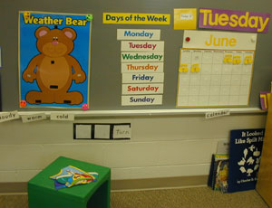 During Circle-time children practice saying the days of the week, add a date to the monthly calendar, and dress the Weather Bear.