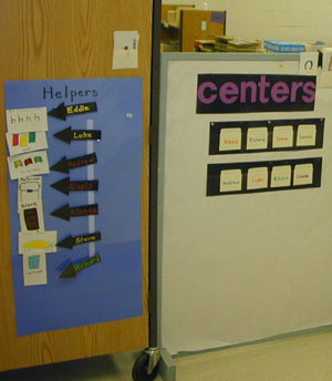 Each student's name card is beside a helping task. A picture card showing a center activity is put in each child's pocket.